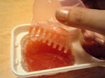 水でといた甘い液体をスポイト(たこ)で吸い取り別の液体に垂らすとゼリーが出来ます。