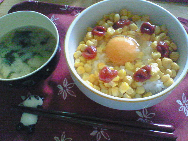 コーンの上にたまごとケチャップをのせたたまごかけごはん。