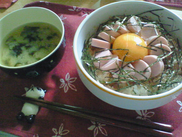 かつお節の上に魚肉ソーセージとたまごと海苔をのせて醤油でさらっと食べるたまごかけごはん。